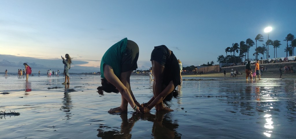 Lower image: Komang with student, colleague and friend Tety, at Canggu beach, Bali